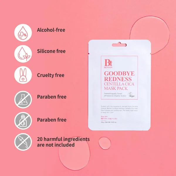 Η Goodbye Redness Centella Mask της Benton είναι μια sheet μάσκα με σύνθεση από 45% εκχύλισμα centella asiatica που καταπραΰνει και ενυδατώνει το δέρμα. Είναι ιδανική για επιδερμίδες με ευαισθησίες που έχουν την τάση να κοκκινίζουν. Περιέχει υαλουρονικό οξύ και διάφορα φυτικά συστατικά που παρέχουν το κατάλληλο επίπεδο υγρασίας στο δέρμα διατηρώντας το ήρεμο, λείο και φωτεινό.