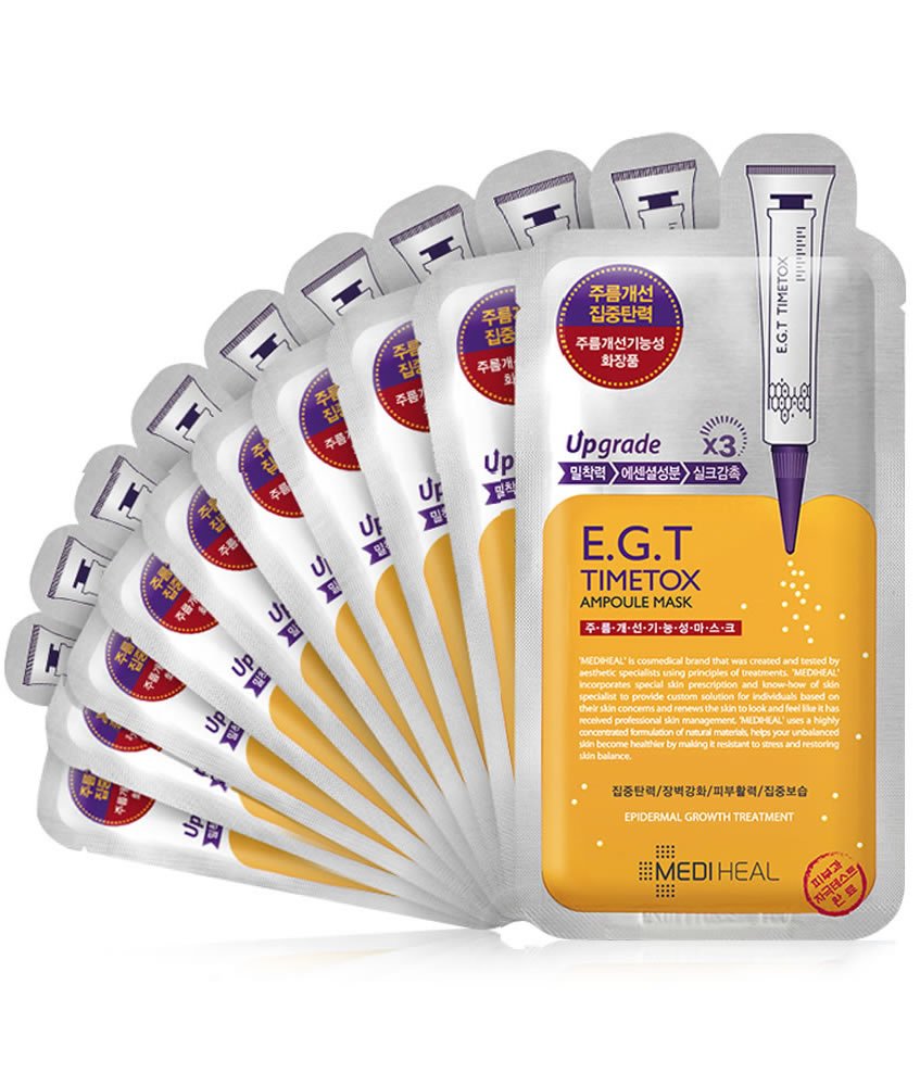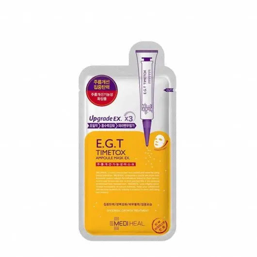 Mάσκα αμπούλας EGT Timetox της Mediheal δίνει το αποτέλεσμα των fillers και του botox, στα οποία συσφίγγει & ανασηκώνει το δέρμα, για να βελτιώσει την υφή του.