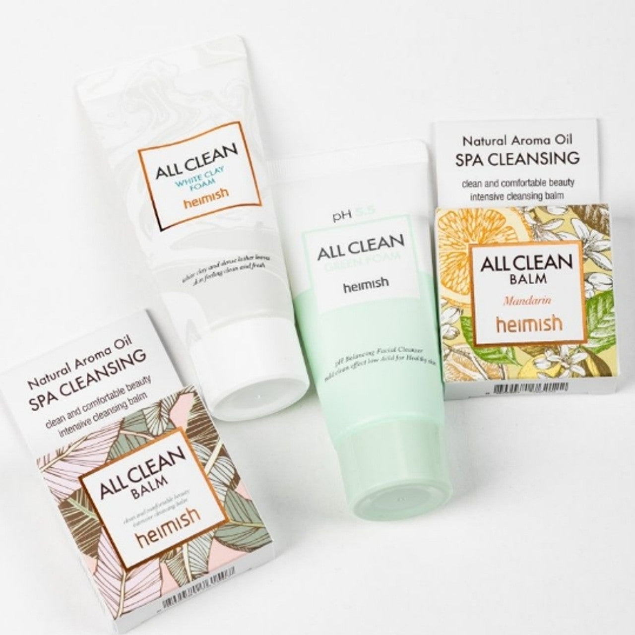 Heimish White Clay Foam: Water, Glycerin, Stearic Acid, Myristic Acid, PEG-32, Potassium Hydroxide, Lauric Acid, Bentonite, Potassium Cocoate, Butylene Glycol, Cocamidopropyl Betaine, Potassium Cocoyl Glycinate, Glyceryl Stearate, PEG-100 Stearate, Kaolin, Citrus Aurantium Dulcis (Orange) Peel Oil, Lavandula Angustifolia (Lavender) Oil, Amyris Balsamifera Bark Oil, Pelargonium Graveolens Flower Oil, Cocos Nucifera (Coconut) Oil, Citrus Paradisi (Grapefruit) Peel Oil, Litsea Cubeba Fruit Oil, Eucalyptus Globulus Leaf Oil, Melaleuca Alternifolia (Tea Tree) Leaf Oil, Mentha Arvensis Leaf Oil, Boswellia Carterii Oil, Citrus Aurantium Bergamia (Bergamot) Fruit Oil, Juniperus Mexicana Oil, Myristica Fragrans (Nutmeg) Kernel Oil, Tagetes Minuta Flower Oil, Jasminum Officinale (Jasmine) Flower/Leaf Extract, Nelumbo Nucifera Flower Extract, Freesia Refracta Extract, Iris Versicolor Extract, Leontopodium Alpinum Flower/Leaf Extract, Lilium Candidum Bulb Extract, Narcissus Pseudo-Narcissus Flower Extract, Rose Extract, PEG-75, Polyquaternium-7, Hyaluronic Acid, Hydrolyzed Hyaluronic Acid, Sodium Hyaluronate, Ethylhexylglycerin, Hydrolyzed Silk, Disodium EDTA, Sodium Benzoate, Phenoxyethanol, Fragrance. Heimish All Clean Green Foam:Water, Potassium Laureth Phosphate, Glycerin, Lauryl Hydroxysultaine, Acrylates/C10-30 Alkyl Acrylate Crosspolymer, Quillaja Saponaria Bark Extract, Centella Asiatica Extract, Hamamelis Virginiana Water, Potassium Cocoyl Glutamate, Citric Acid, Coco-Glucoside, Sodium Chloride, Caprylyl Glycol, Glyceryl Caprylate, Tromethamine, Sodium Cocoyl Glutamate, Sodium Cocoyl Isethionate, 1,2-Hexanediol, Disodium EDTA. Heimish All Clean Balm:Ethylhexyl Palmitate, Cetyl Ethylhexanoate, PEG-20 Glyceryl Triisostearate, Polyethylene, PEG-8 Isostearate, 1,2-Hexanediol, Butyrospermum Parkii (Shea) Butter, Tocopheryl Acetate, Citrus Aurantium Dulcis (Orange) Peel Oil, Lavandula Angustifolia (Lavender) Oil, Pelargonium Graveolens Flower Oil, Amyris Balsamifera Bark Oil, Eucalyptus Globulus Leaf Oil, Melaleuca Alternifolia (Tea Tree) Leaf Oil, Citrus Paradisi (Grapefruit) Peel Oil, Citrus Aurantium Bergamia (Bergamot) Fruit Oil, Boswellia Carterii Oil, Juniperus Mexicana Oil, Water, Cocos Nucifera (Coconut) Fruit Extract, Butylene Glycol, Citrus Aurantifolia (Lime) Fruit Extract, Citric Acid, Phenoxyethanol, Nelumbium Speciosum Flower Extract, Freesia Refracta Extract, Rose Extract, Leontopodium Alpinum Extract, Jasminum Officinale (Jasmine) Extract, Narcissus Pseudo-Narcissus (Daffodil) Flower Extract, Lilium Tigrinum Extract, Iris Versicolor Extract, Ethylhexylglycerin, Limonene, Citral, Linalool. Heimish All Clean Balm Mandarin:Ethylhexyl Palmitate, Cetyl Ethylhexanoate, PEG-20 Glyceryl Triisostearate, Synthetic Wax, PEG-8 Isostearate, Synthetic Wax, Artemisia Vulgaris Oil, Citrus Aurantium Amara (Bitter Orange) Leaf/Twig Oil, Lavandula Angustifolia (Lavender) Oil, Litsea Cubeba Fruit Oil, Laurus Nobilis Leaf Extract, Cetyl PEG/PPG-10/1 Dimethicone, 1,2-Hexanediol, Curcuma Longa (Turmeric) Root Extract, Melia Azadirachta Flower Extract, Melia Azadirachta Leaf Extract, Corallina Officinalis Extract, Melia Azadirachta Bark Extract, Moringa Oleifera Seed Oil, Ocimum Sanctum Leaf Extract, Tocopheryl Acetate, Eclipta Prostrata Extract, Melia Azadirachta Leaf Extract, Moringa Oleifera Seed Oil, Glycerin, Moringa Oleifera Seed Oil, Ceramide NP, Phytosphingosine, Hydrogenated Lecithin, Moringa Oleifera Seed Oil, Octyldodecanol, Oleyl Alcohol, Butyrospermum Parkii (Shea) Butter, Candida Bombicola/Glucose/Methyl Rapeseedate Ferment, Glycine Soja (Soybean) Sterols, Tocopherol, Citrus Junos Fruit Oil, Citrus Unshiu Fruit Oil, Water, 1,2-Hexanediol, Citrus Reticulata (Tangerine) Fruit Extract, Water, Butylene Glycol, Camellia Sinensis Leaf Extract, Vaccinium Macrocarpon (Cranberry) Fruit Extract, Water, Butylene Glycol, Carica Papaya (Papaya) Fruit Extract.